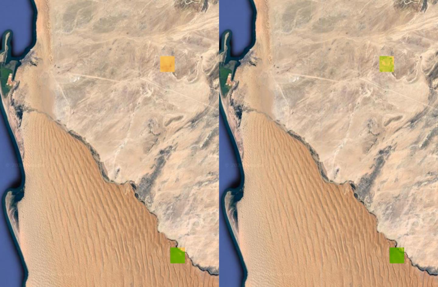 image: Two satellite images show vegetation change from fog in two areas of the Namib desert. The left image shows the areas during periods of lower fog; the right image shows the areas during periods of higher fog. Greener areas inside the squares indicate vegetation greening.