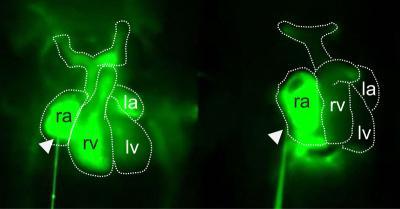 This image (right) shows defective cardiac function (Fendrr mutations) in mouse embryos at 12.5 days, in comparison to normal embryos (left). (la left atrium, lv left ventricle, ra right atrium, rv right ventricle)