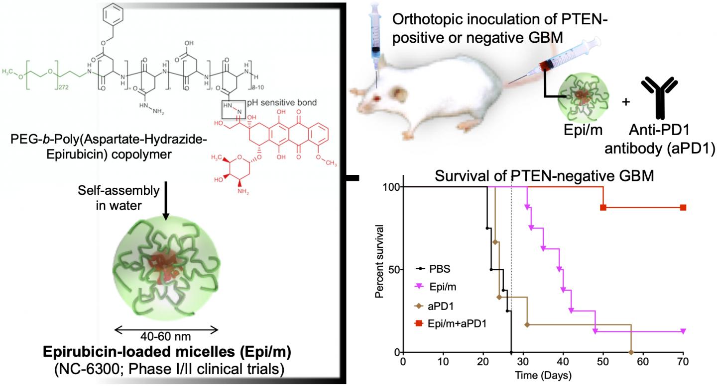 A nanomedicine-based strategy for chemo-immunotherapy (CIT) of glioblastoma (GBM), which has the worst prognosis among brain tumors, was successfully developed. In vivo experiments demonstrated that the combined use of epirubicin-encapsulating nano-micelles (Epi/m) with immune checkpoint inhibitors (ICI) eradicated PTEN-negative GBM, which is highly resistant to ICI alone. Due to the synergistic effects of Epi/m plus ICI combination, the number of tumor-infiltrating T cells (TIL) and other antitumor immune cells significantly increased to kill cancer cells effectively. On the other hand, intratumoral bone marrow-derived immunosuppressive cells (MDSC), which interfere with the immune response, were significantly reduced. The CIT also provided robust immunological memory effects against the tumors, which effectively rejected newly implanted PTEN-negative GBM cells in the brain. While free epirubicin can cause damage to organs, including hematopoietic organs especially, our nanomedicine strategy significantly reduced these side effects, improving the immune response. Epi/m has already advanced into clinical trials for other cancer types, and this CIT strategy could be expected to be translated to clinical evaluation in the future. These results has been published in ACS Nano (Impact Factor = 14.588 in 2019) issued on August 6 by the American Chemical Society.