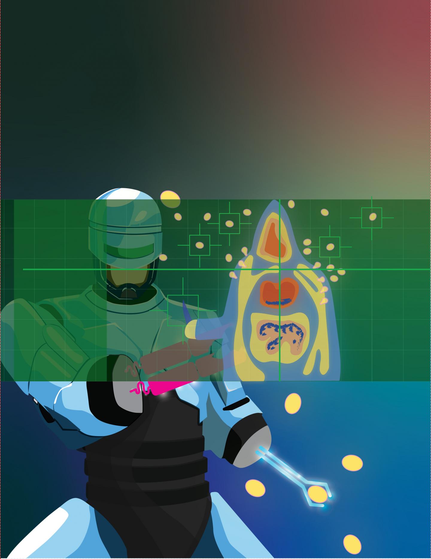 image: A UT Southwestern study discovered the molecular mechanism by which tumors defective in DNA mismatch repair respond to immunotherapy. This illustration depicts how cells use a programmed mismatch repair deficiency-activated system (robot) to detect and eliminate tumors (yellow cells).