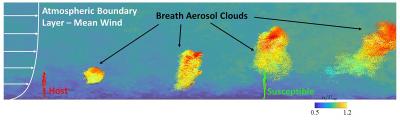 image: Large-eddy simulation results of the aerosol "clouds" generated by the breathing of an infected host in a turbulent boundary layer.