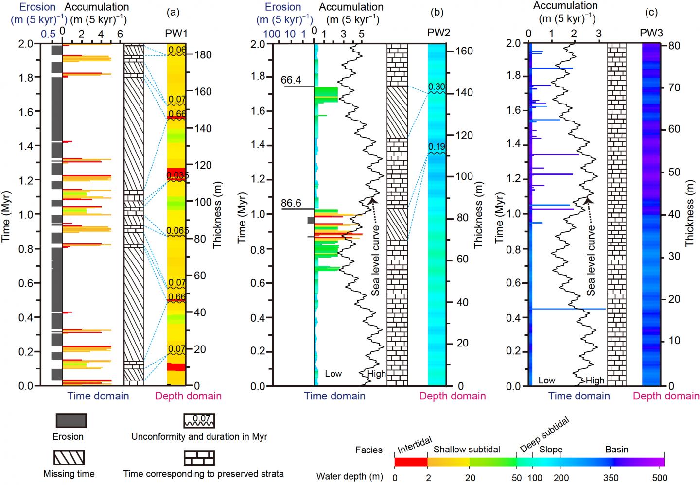 image: Columns of depth and time domains at the PW1 (a), PW2 (b) and PW3 (c) locations, corresponding to the platform margin, slope and basinal environments, showing the integrated accumulation and erosion (or slope failure) processes, and the preserved and missing time durations and the corresponding preserved strata.
