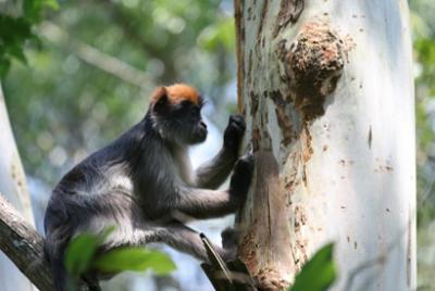 A red colobus monkey prepares to munch on the bark of Eucalyptus grandis, a non-native estrogenic tree in Kibale National Park. Greater consumption of estrogenic plants is linked to altered hormone levels and changes in behavior, according to a new UC Berkeley-led study.