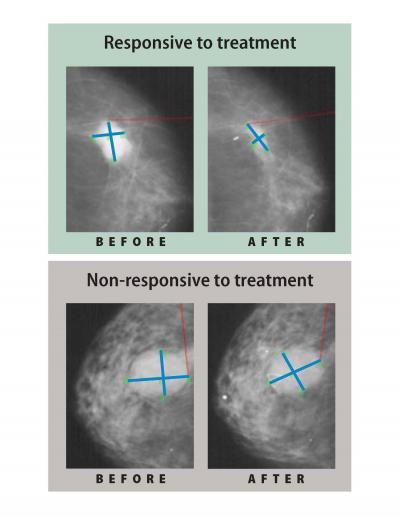 These are mammograms of estrogen-receptor positive breast tumors before and after 16 weeks of aromatase inhibitor therapy. The top two images show a tumor that responded to the treatment and regressed. The bottom two images show a tumor that was resistant to the treatment and stayed about the same size. Ellis hopes whole-genome analysis will help explain drug-resistance so that new treatments can be found.