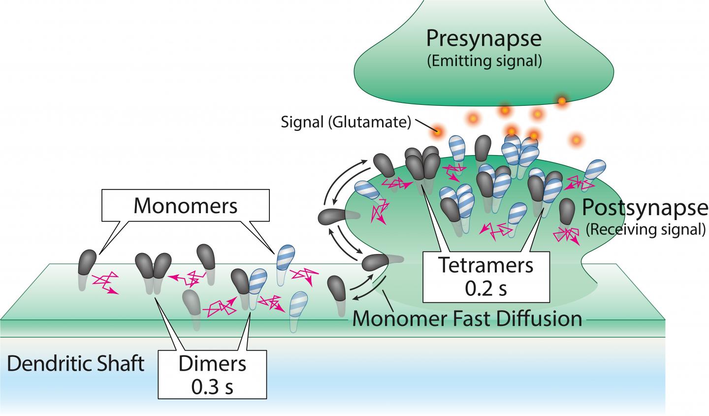 By studying how the AMPA receptor molecules jostled around in the membrane and bound to each other, the researchers found that the AMPA receptor subunits existed as single molecules as well as assemblies two, three, and four molecules.