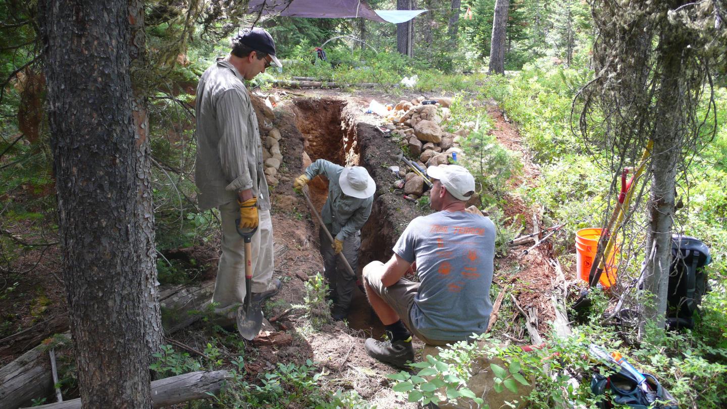 image: The excavation of trench B at the Leigh Lake site. Shown in the photo (from left to right) are Glenn Thackray, Cooper Brossy, and Darren Zellman.