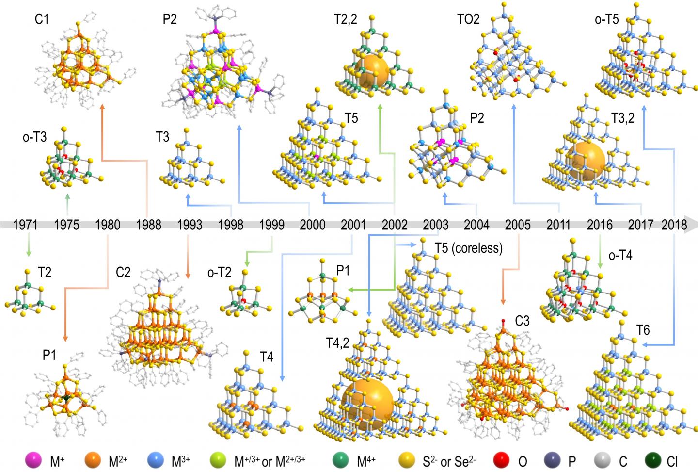 image: Development of the MCSC family, including basic-supertetrahedral Tn clusters, capped-supertetrahedral Cn clusters, penta-supertetrahedral Pn clusters, pseudo-Tn clusters (oxychalcogenide o-Tn clusters, super-supertetrahedral Tp,q clusters and Tn (coreless) clusters) and TO2 clusters.