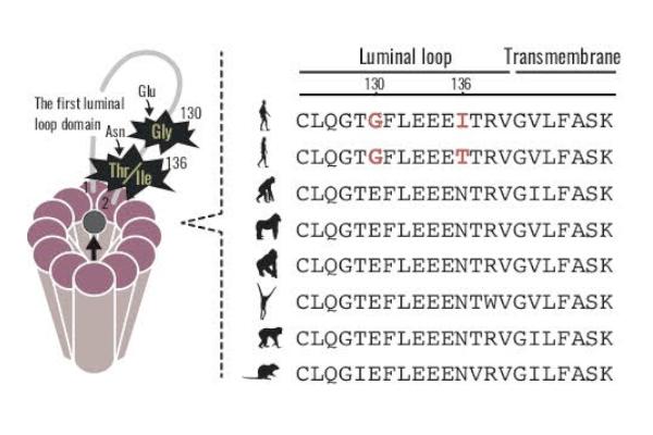 image: VMAT1 (vesicular monoamine transporter 1) has two human-specific mutations in its amino acid sequence, 130Glu->Gly and 136Asn->Thr. The 136Ile variant has additionally emerged recently, putatively along with Out-of-Africa migration of modern humans.