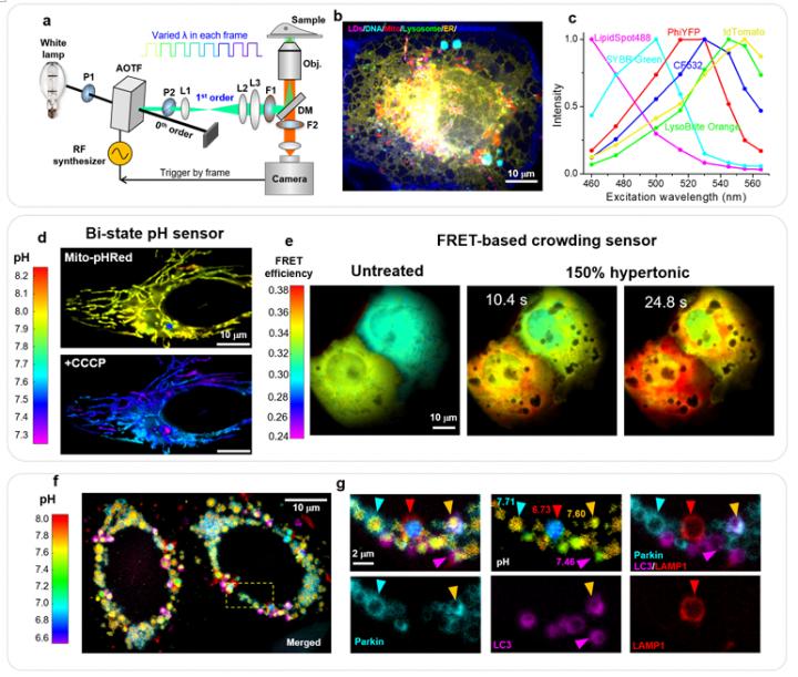 In a new paper published in Light: Science & Application, a team of scientists, led by Professor Ke Xu from College of Chemistry, University of California, Berkeley, USA have demonstrated that using a single, fixed fluorescence emission detection band, through frame-synchronized fast scanning of the excitation wavelength from a white lamp via an acousto-optic tunable filter (AOTF), up to 6 subcellular targets, labeled by common fluorophores of substantial spectral overlap, can be simultaneously imaged in live cells with low (~1%) crosstalks and high temporal resolutions (down to ~10 ms). The demonstrated capability to quantify the abundances of different fluorophores in the same sample through unmixing the excitation spectra next enabled them to devise novel, quantitative imaging schemes for both bi-state and FRET (Förster resonance energy transfer) fluorescent biosensors in live cells. They thus achieved full-frame high sensitivities and spatiotemporal resolutions in quantifying the mitochondrial matrix pH and the intracellular macromolecular crowding. They thus unveiled significant spatial heterogeneities in both parameters, including spontaneous sudden jumps in the mitochondrial matrix pH accompanied by dramatic mitochondrial shape changes. They further demonstrated, for the first time, the multiplexing of absolute pH imaging with three additional target organelles/proteins to elucidate the complex, Parkin-mediated mitophagy pathway.