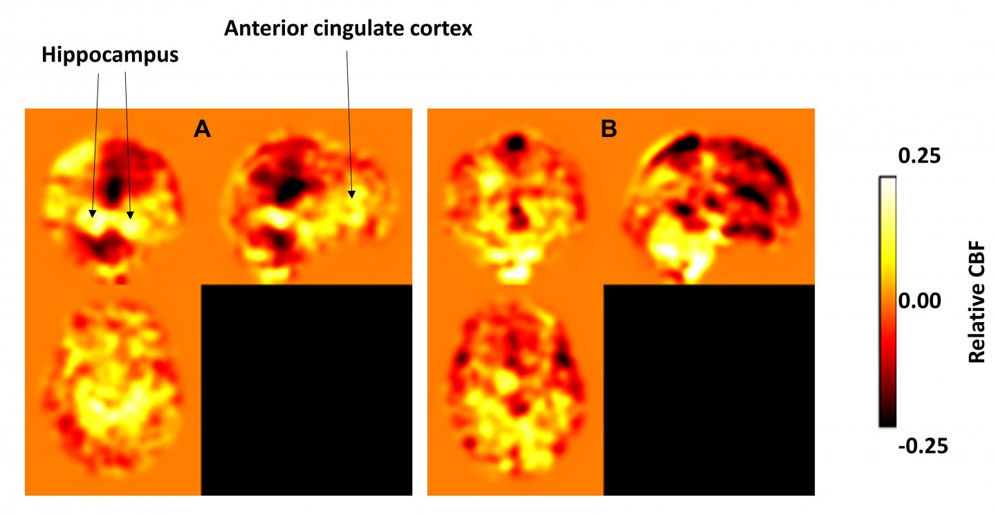 image: The 'A' image shows the cerebral blood flow in a group of older adults at risk to develop Alzheimer's disease after one year of aerobic exercise training. The yellow and white represents increased flow into the hippocampus, the anterior cingulate cortex, and other frontal regions. The 'B' image shows no change or a reduction in blood flow in a group of at-risk older adults who did one year of stretching only.