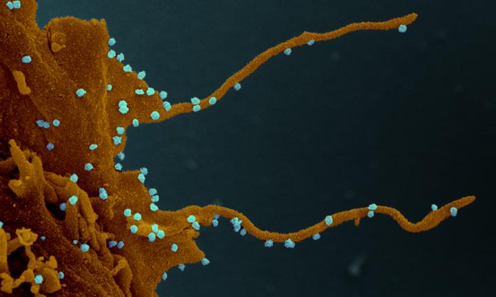 image: SARS-CoV-2 viruses visible on a cell with filopodia