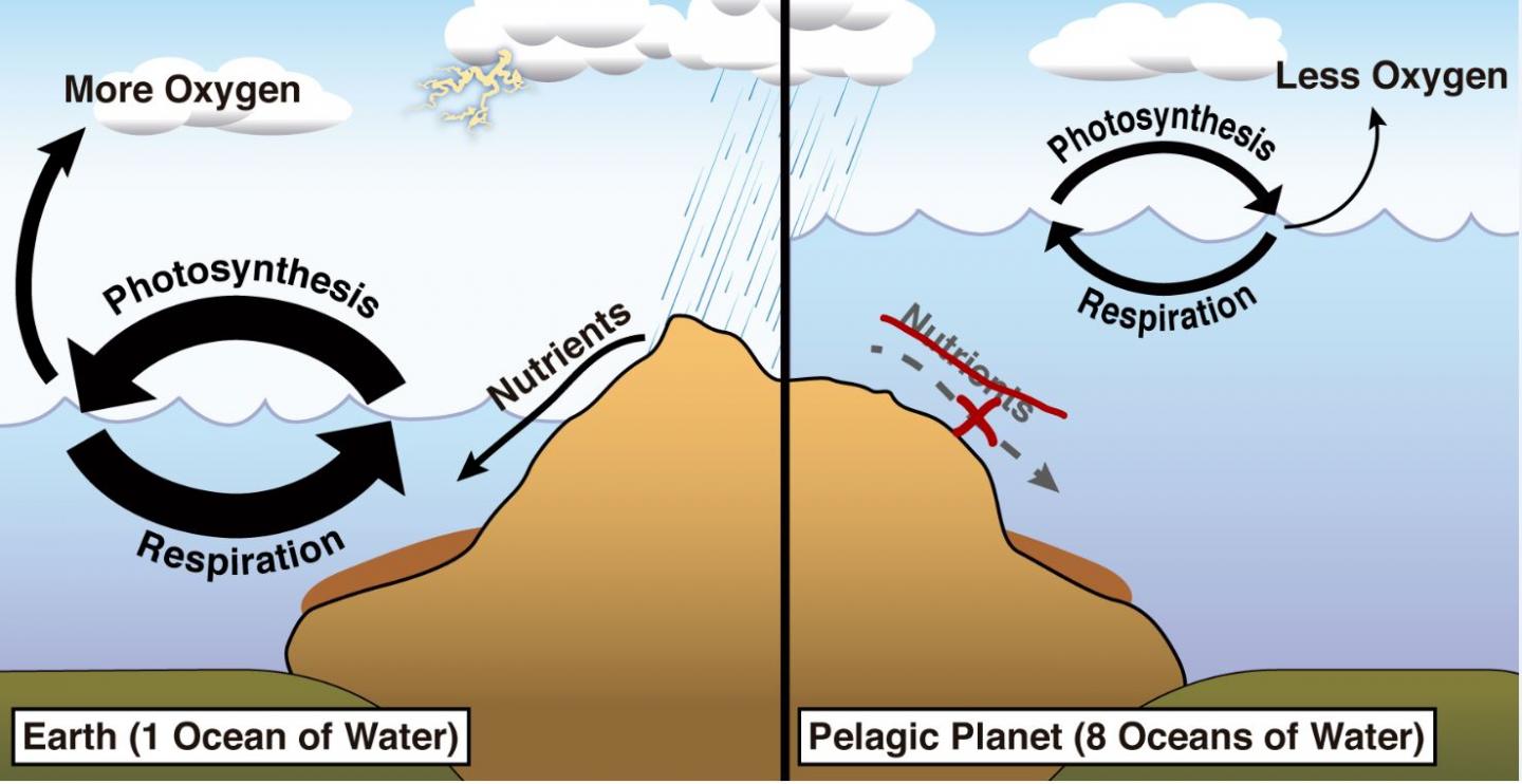 image: On the left, the oxygen-producing biosphere (photosynthesis/respiration) is fed by nutrient runoff from land. On the right, if you increased water on Earth enough to cover all land, then nutrient runoff is stopped. This significantly reduces how much oxygen the biosphere can produce.