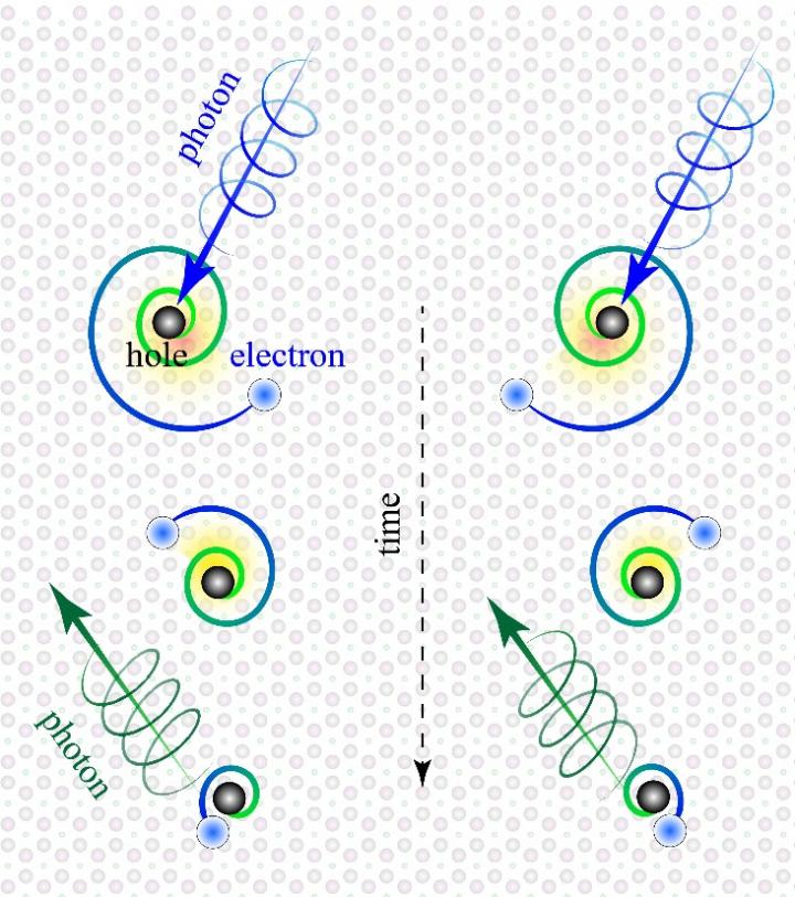 image: The two types of 'chiral surface excitons' are on the right and left side of the image. They are generated by right- and left-handed light (photons in blue). The excitons consist of an electron (light blue) orbiting a 'hole' (black) in the same orientation as the light. The electron and hole are annihilated in less than a trillionth of a second, emitting light (photons in green) that could be harnessed for lighting, solar cells, lasers and electronic displays.