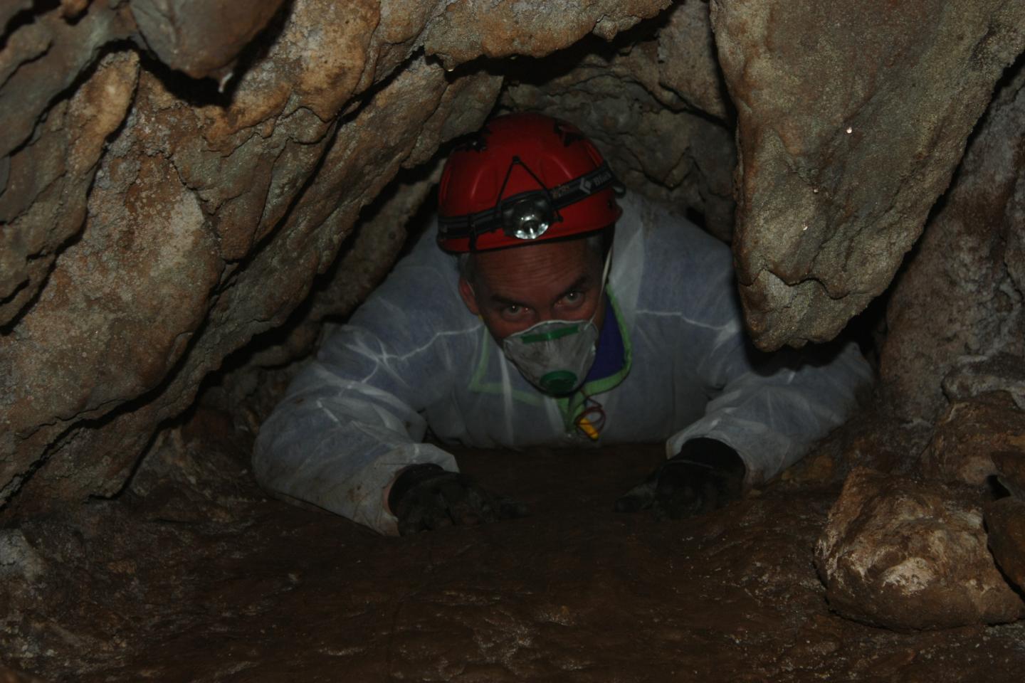 Professor Hamish McGowan wearing a headlamp crawling through a small cave to gain access to stalagmites around 120 metres below the surface in the Grotto Cave, NSW."In modern times, heating is being caused by high concentrations of greenhouse gases, though this period is still a good analogue for our current-to-near-future climate predictions."