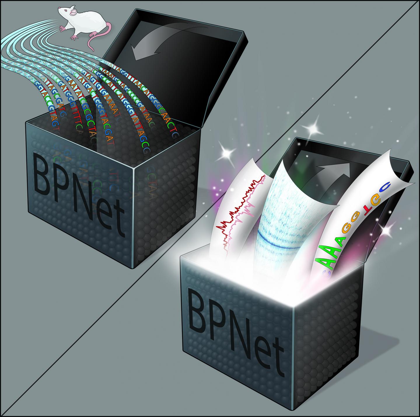 image: Researchers used DNA sequences from high-resolution experiments to train a neural network called BPNet, whose "black box" innerworkings were then uncovered to reveal sequence patterns and organizing principles of the genome's regulatory code.