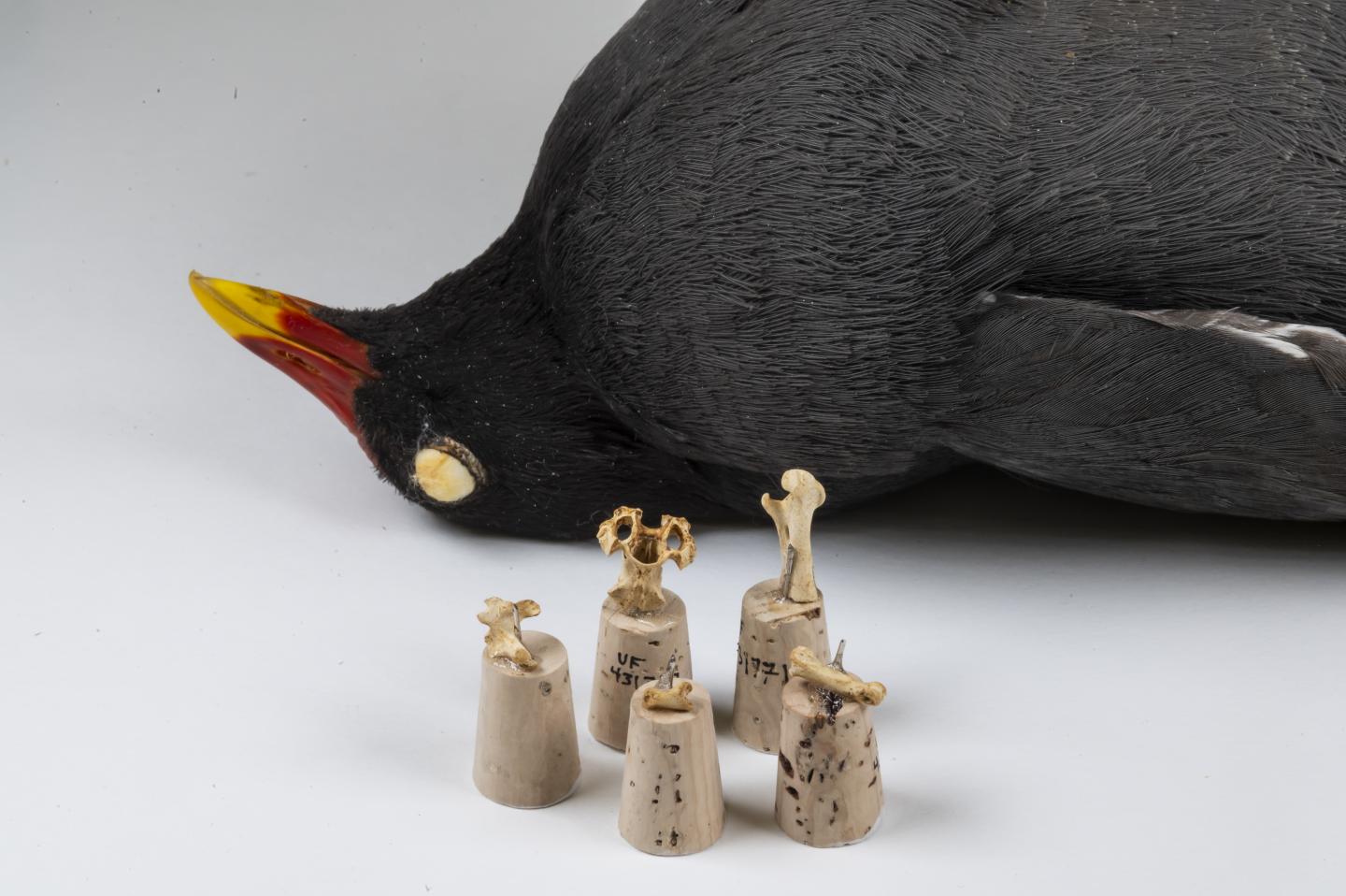 image: These tiny fossil bones belonged to a Haitian cave-rail, Nesotrochis steganinos, an extinct species unique to the Caribbean. While the bird may have resembled a common gallinule, pictured here, ancient DNA analysis reveals Nesotrochis' closest relatives are found in Africa, New Guinea and New Zealand.