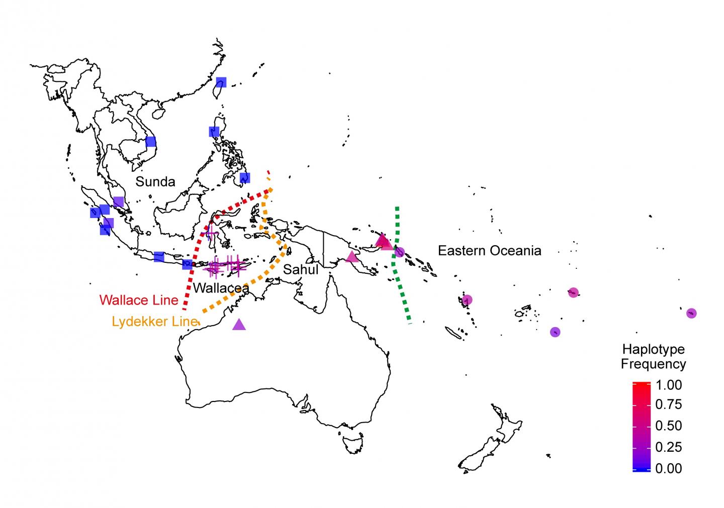 image: This map shows the frequency of the Denisovan TNFAIP3 gene variant in modern human populations of Island South East Asia and Oceania, it is found to be common east of the Wallace Line.