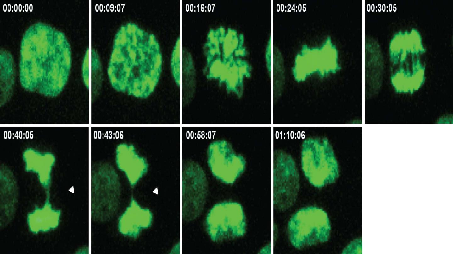 image: The time series shows the process of cell division, with arrows pointing to errors that lead to an imbalance in chromosome number. Research now shows that in cancer cells, chromosomal imbalance can either promote or inhibit metastasis.