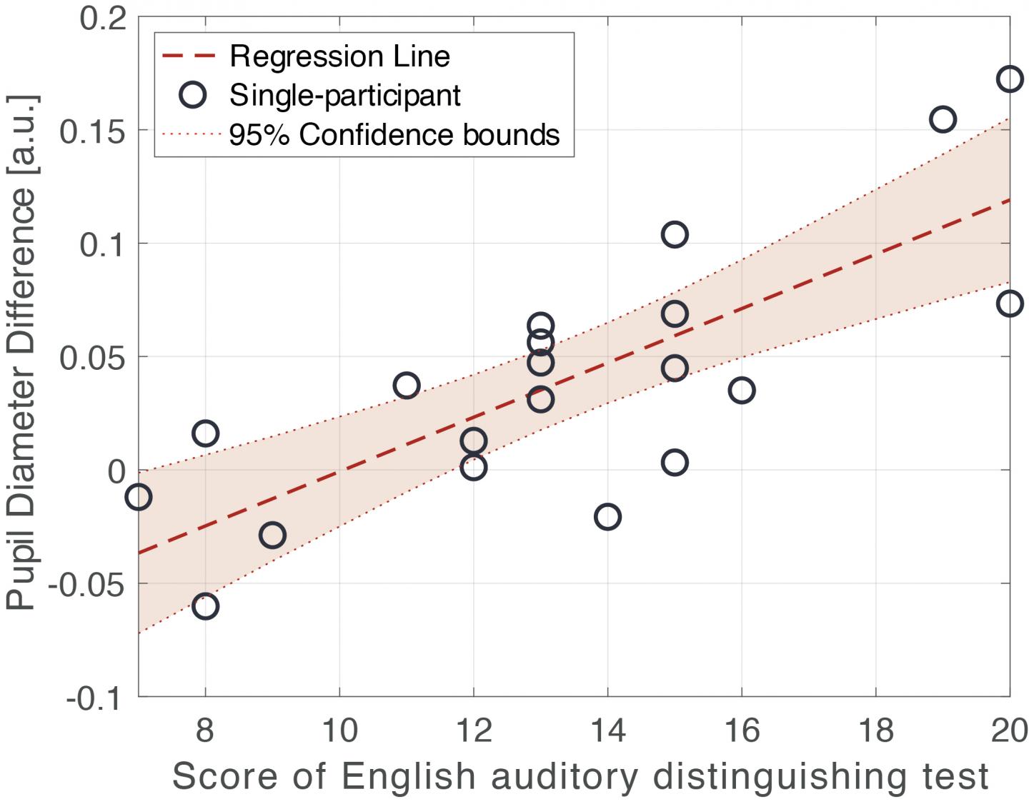 image: The horizontal axis represents the scores of the English auditory distinguishing test performed in advance, and the vertical axis represents the pupil dilation response difference when playing sounds of English words including L and R.