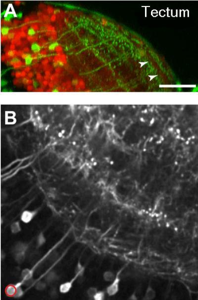 (A) A cell type in the tectum, made visible using a green fluorescent protein, highlights the layering of this visual centre. (B) The same cell type as in (A), but labeled with a calcium-sensitive protein.