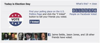 The message featured a reminder that "Today is Election Day"; a clickable "I Voted" button; a link to local polling places; a counter displaying how many Facebook users had already reported voting; and up to six profile pictures of users' own Facebook friends who had reported voting.