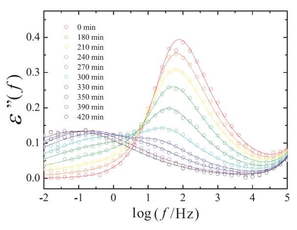 image: Time evolution of dielectric loss spectra during liquid-liquid transition of triphenyl phosphite at 214 K. The horizontal axis is the measurement frequency. The frequency of the peak shifts to lower frequencies with time, the dynamics of liuquid is drastic slowing down of with liquid-liquid transition.
