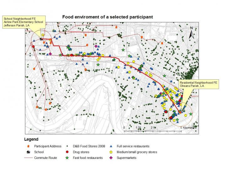 Dornelles analyzed data from 710 elementary school employees in New Orleans, Louisiana. Drawing on existing databases, she determined the number of supermarkets, grocery stores, full-service restaurants, and fast-food restaurants within 1 kilometer of the employees' residential and workplace addresses. She also determined the number and type of food stores within 1 kilometer of the shortest-distance commute path between each employee's residence and their workplace.
