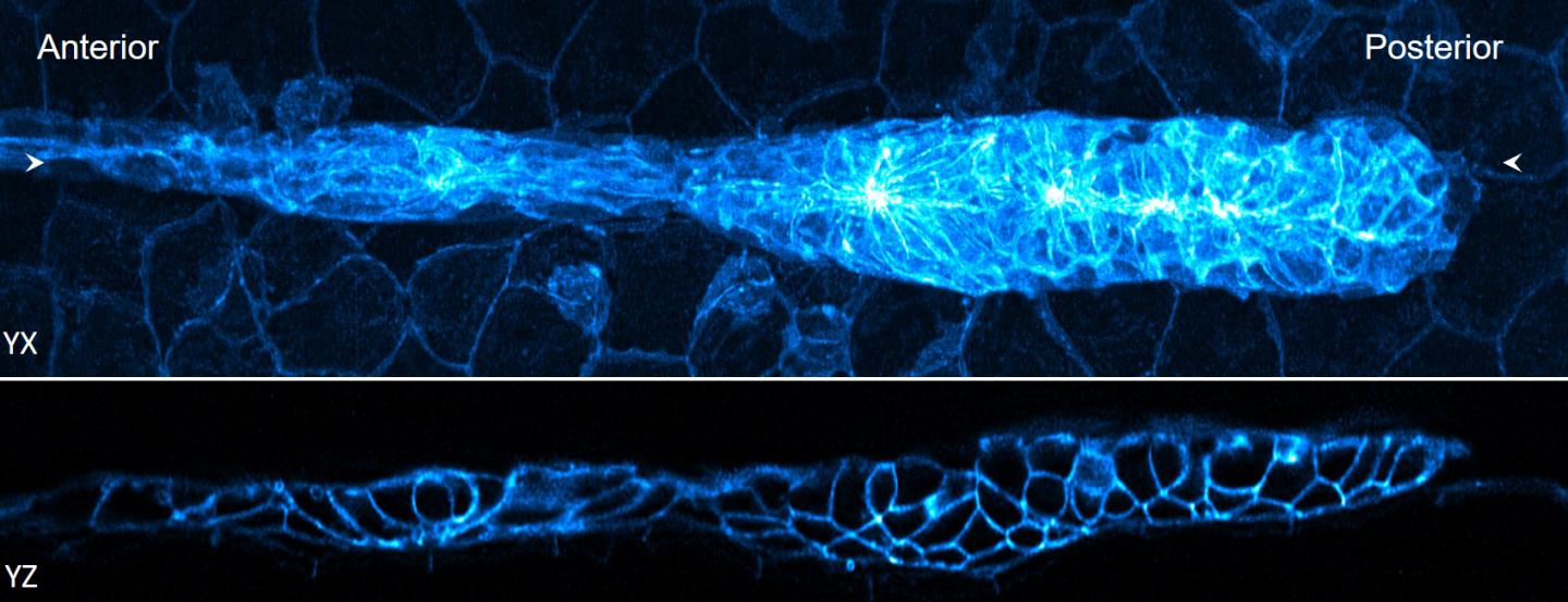 image: Two views of a 32-hour old zebrafish embryo. The blue fluorescence shows the edges of the cells.