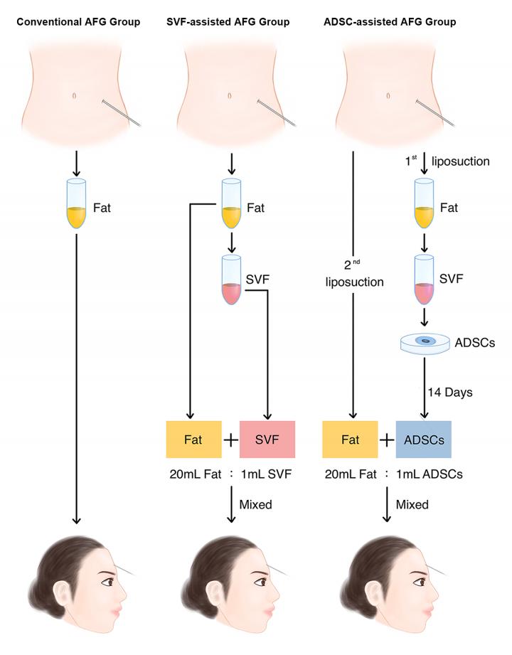 The Wang team's study is believed to be the first clinical study employing ADSCs-assisted fat grafting to treat facial atrophy of LoS. It is also the first to perform a side-by-side comparison of these grafting therapies, revealing significant differences in graft retention. It was performed on 18 LoS patients exhibiting facial atrophy on their foreheads and cheeks. One group received conventional AFG; a second group was treated with SVF-assisted AFG; and a third group received fat grafting with ex vivo-enriched ADSCs. The mixture of ADSCs-enriched fat grafts was supplemented with 5 × 105 ADSCs/ml fat, a concentration chosen based on the protocols of previous clinical studies of ADSC transplantation.