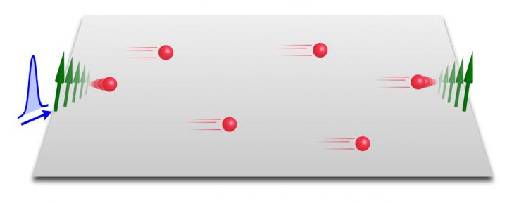 image: A magnetic impulse at the left end causes spin excitations there owing to the time variability of their spins. This converts to the motion of the Majorana particles, that are then transmitted through the material to its opposite edge.