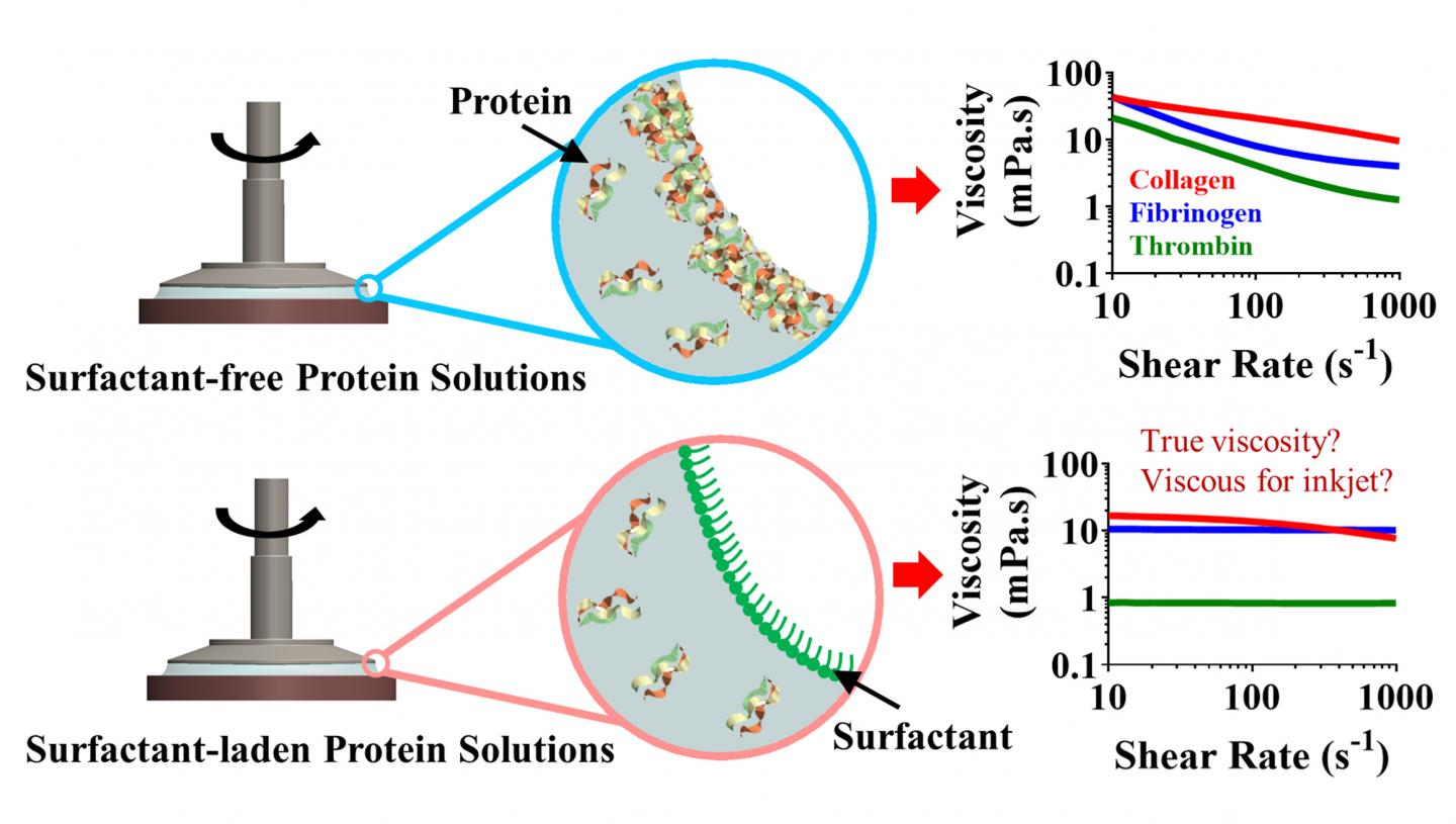 Accurate rheology measurements are vital for successful bioprinting. Measurement of viscosity is important for identifying what protein solutions are potentially printable, and for detecting inconsistencies in flow behavior among different batches of fibrous proteins.