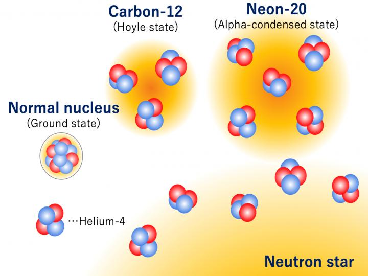 All elements besides hydrogen and helium must have been fused inside the nuclear furnace of a star. The yield during these reactions of carbon-12, which has six protons and six neutrons, is increased by an unusual quirk in that 12 is divisible by 4. This means that given a little extra energy, the nucleons in carbon can form three alpha particles, consisting of two protons and two neutrons each, and these alpha particles can be condensed into the lowest-energy orbit in carbon-12. The existence of an alpha condensed state in heavier isotopes with atomic weights divisible by four, such as neon-20, has been theorized, but remained uncertain. These condensed states would provide a unique window into the world of nuclear physics. This is because the densities of most normal nuclei are very similar to each other, while the alpha condensed state would be an example of a low-density many-body system. Measuring the properties of protons and neutrons in such a dilute state would be very helpful for understanding the nature of low-density nuclear matter that exists on the surface of neutron stars.