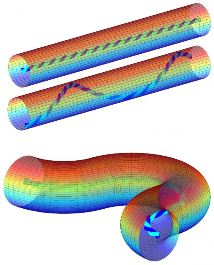 Computer simulations of filopodia dynamics indicate that a rotating actin structure inside the tube results in friction between the membrane and the actin, leading to the spiral form that is observed. Credit: Niels Bohr Institute