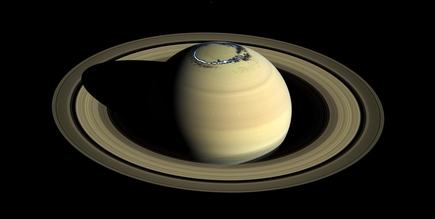 image: Composite of a true colour image of Saturn, observed by Cassini in 2016, overlaid with a false colour representation of the ultraviolet aurora in the northern hemisphere as observed on 20 August 2017.