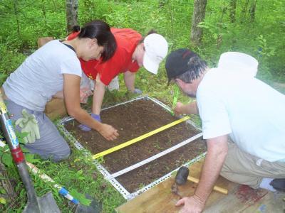 From the left, ORNL's Joanne Childs, Colleen Iversen and Rich Norby dig soil pits and excavate roots and soil at the FACE site.