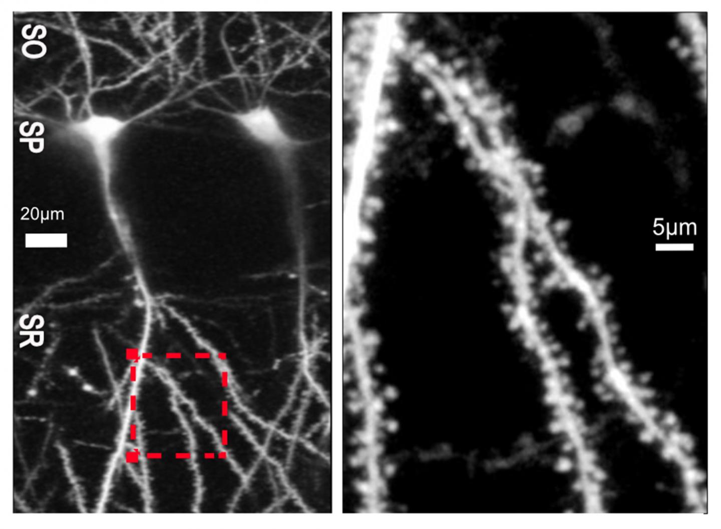 image: Neurons from the hippocampus region of a rodent brain (left); A zoomed in section of the neural dendrites show spines where many synaptic connections with other neurons are formed.