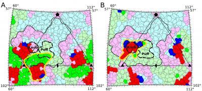 These images illustrate antibody "footprints" outlined in yellow on the surface of a virus called EV71. Three distinct proteins - out of a total of 180 - that make up the viral capsid are outlined in blue, green, and red. The neutralizing antibodies E18 (A) and E19 (B), used in this study were found to bind to the viral proteins where the colors are bright. The E18 antibody causes the viral capsid to open, resulting in the loss of the viral genome, suggesting the virus no longer has the ability to replicate in the human host.