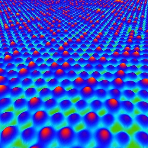 image: Scanning tunneling microscopy image of a Si-Ge alloy with a composition of Si5.67Ge0.33. Tall protrusions correspond to Ge atoms and short ones to Si atoms. The distance between protrusions is only 0.64 nm.
