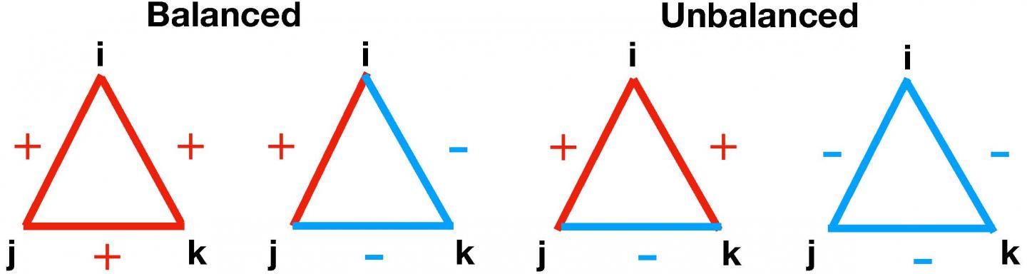 The second concept is the Social Balance Theory (SBT) of the Austrian psychologist Fritz Heider (1946). Put simply, it describes the fact that people are keen to ensure that their friends get along well with each other. "We like to construct social triangles," Stefan Thurner (CSH & Medical University of Vienna) points out. "What we like best is when all three in the triangle love each other. What we don't like is when two people with whom we are on good terms do not like or argue with each other. As a matter of fact, such states of imbalance occur much less frequently in societies."