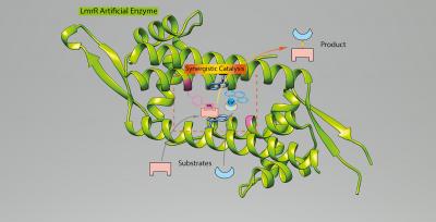 image: This illustration shows the structure of the LmrR protein (green), with the two added catalytic groups binding to their substrates.