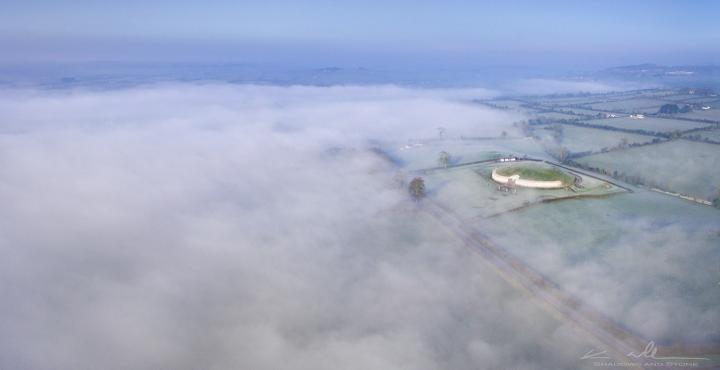 image: Newgrange as seen on a misty morning.