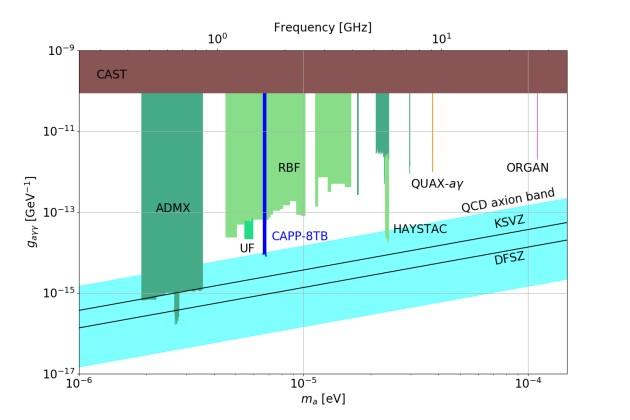 image: The lower horizontal axis is the axion mass, the upper horizontal axis is the microwave frequency corresponding to the mass, and the vertical axis is the coupling constant of axion-to-photon conversion. Both axes are in logarithm scales. CAPP-8TB indicates the range of mass reported in this study. CAST indicates experimental results from CERN (Switzerland) published in 2017, RBF is the result from Brookhaven National Laboratory (BNL) in a collaboration of University of Rochester, BNL, and Fermi National Accelerator Laboratory (US) published in 1989. UF is the result from University of Florida (US) published in 1990, ADMX is the range scanned at University of Washington (US) from 1998 to 2018. HAYSTAC is the result scanned at Yale University (US) from 2017 to 2018. ORGAN and QUAX-aγ are the results from University of Western Australia (Australia) and INFN (Italy) in 2017 and 2019, respectively. KSVZ and DFSZ are two models that can solve the strong CP problem.