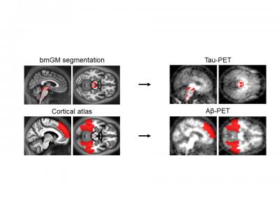 image: State-of-the-art automatic brainstem segmentation methods were used to extract tau burden in its first aggregation site, that is, in the brainstem monoaminergic grey matter (bmGM). Beta-amyloid (Aβ) burden was extracted in the earliest cortical aggregation regions, i.e. in the bilateral medial superior frontal, inferior temporal, and fusiform areas.