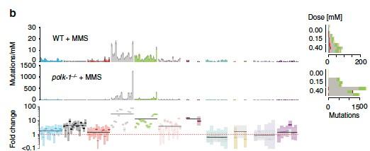 image: Example of base substitutions caused by the mutagen MMS (methyl-methan sulfonate) differ between WT (upper panel) and polk DNA repair defective strains (lower panel), T>A changes (indicted in gray) being increased >30 times.