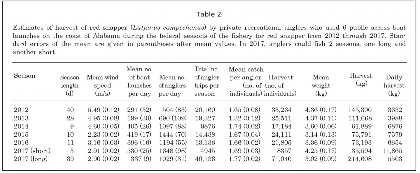 launches on the coast of Alabama during the federal seasons of the fishery for red snapper from 2012 through 2017. Standard