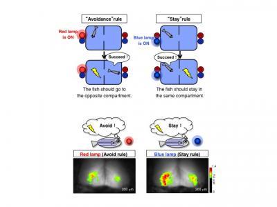 The team then tested whether memories for the best behavioral choices can be modified by new learning. The fish were trained to learn two opposite avoidance behaviors, each associated with a different LED color, blue or red, as cue. They find that presentation of the different cues leads to the activation of different groups of neurons in the telencephalon, which indicates that different behavioral programs are stored and retrieved by different populations of neurons.