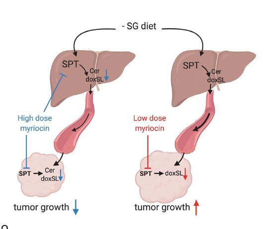 image: Schematic describing in vivo sphingolipid physiology under high- and low-dose myriocin treatments.