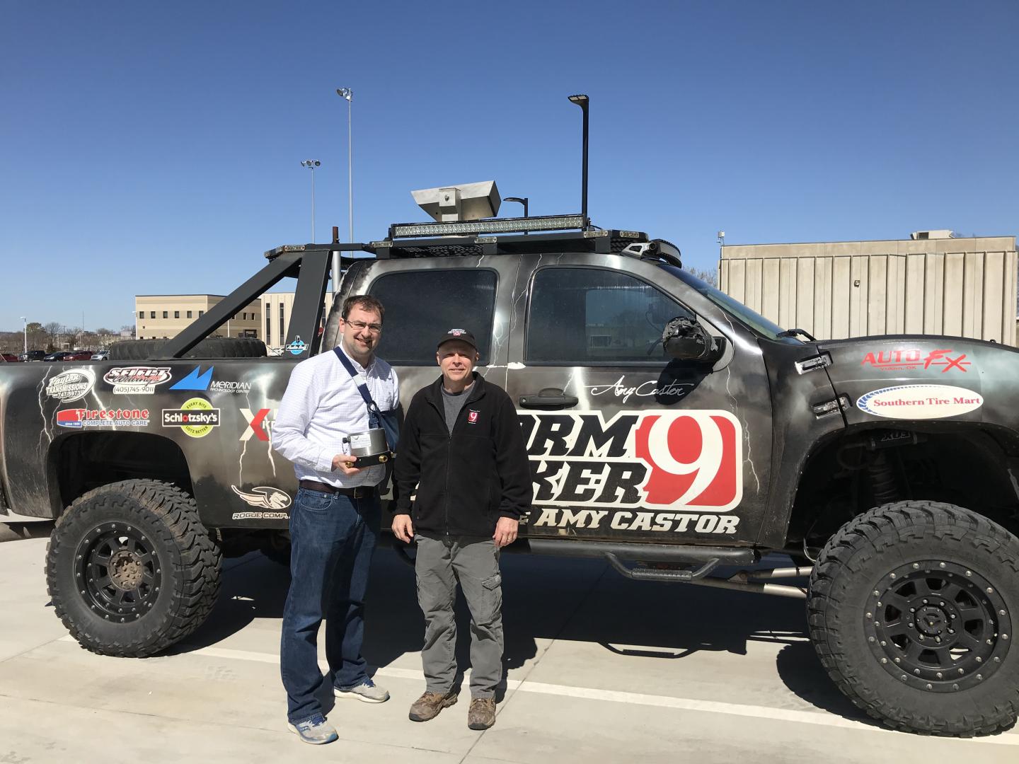 image: Brian Elbing (left) holds a microphone with storm chaser Val Castor (right) in front of his storm chasing truck, in which the researchers mounted an infrasound sensor for monitoring tornadoes.