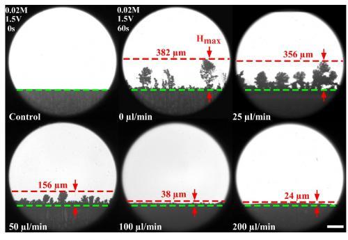 "With this fundamental study and microfluidic approaches, we were able to quantitatively understand the effect of flow on dendrite growth," he said. "Not many groups have studied this yet."