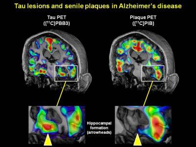 In this latest research in mice and humans, investigators developed fluorescent compounds that bind to tau (called PBBs) and used them in positron emission tomography (PET) tests to correlate the spread of tau tangles in the brain with moderate Alzheimer's disease progression. "PET images of tau accumulation are highly complementary to images of senile amyloid beta plaques and provide robust information on brain regions developing or at risk for tau-induced neuronal death," says senior author Dr. Makoto Higuchi, of the National Institute of Radiological Sciences in Japan. "This is of critical significance, as tau lesions are known to be more intimately associated with neuronal loss than senile plaques."